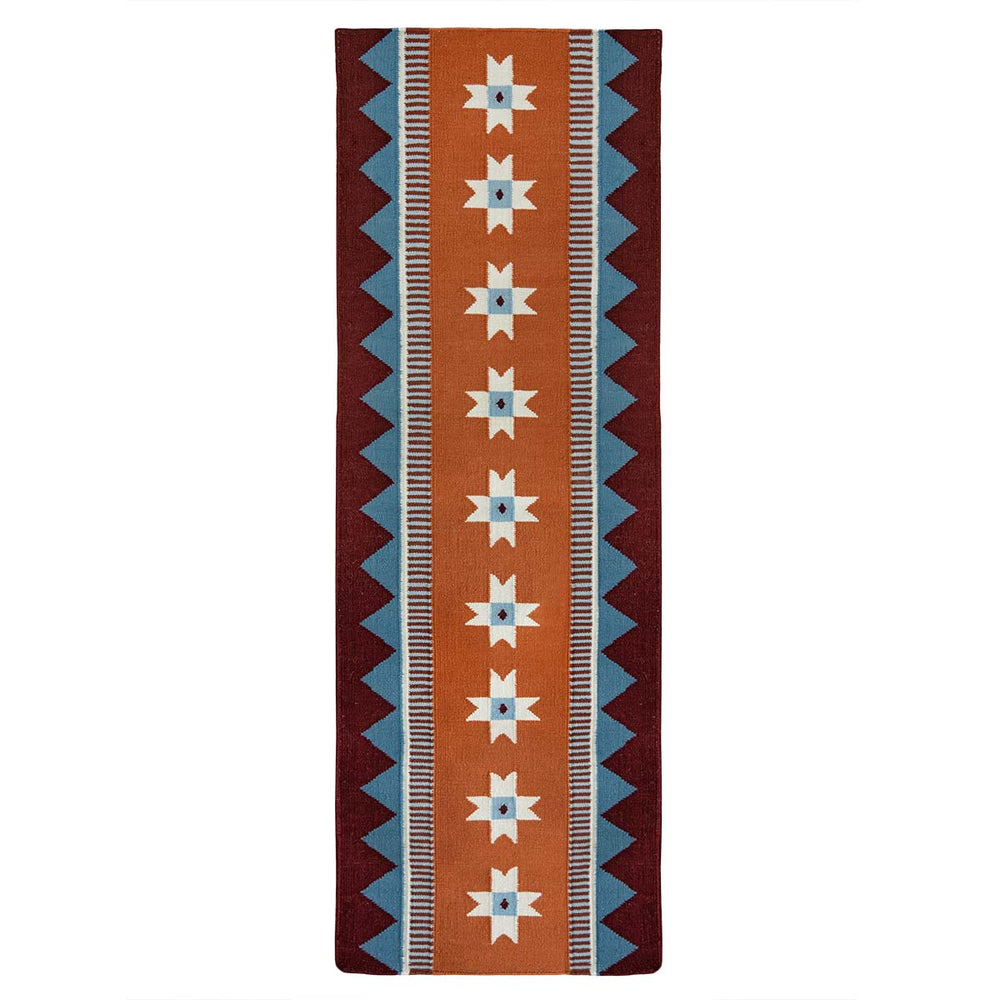A modern interpretation of traditional Victorian tile designs, this colourful flatweave runner is handwoven in a striking combination of orange, claret brown and blue.