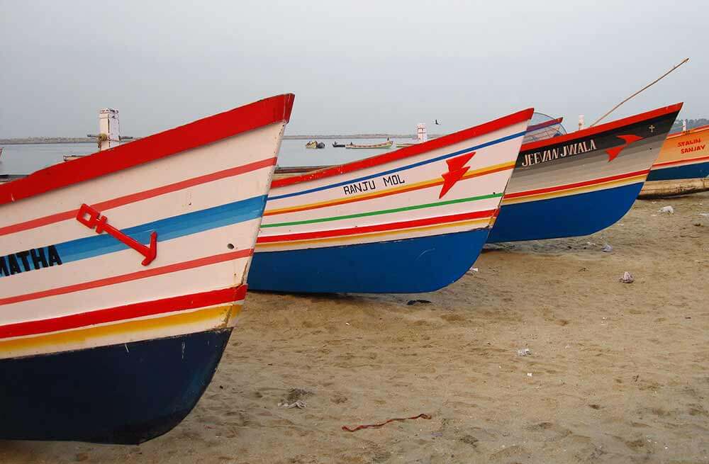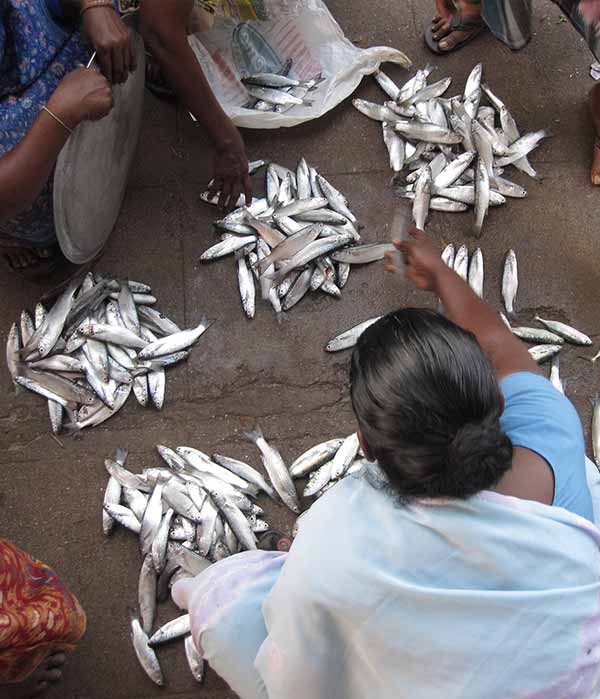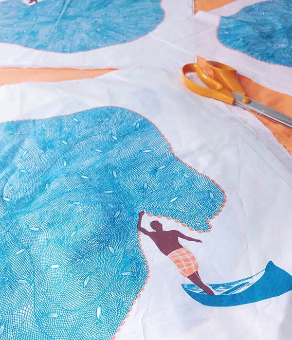 Everyday fishermen from all over Kerala head out to catch the freshest fish. Various techniques are used from Chinese fishing nets to line fishing and bamboo traps, but our popular Catch of the Day cushion illustrates the simplest method of all, a net cast out into the blue.