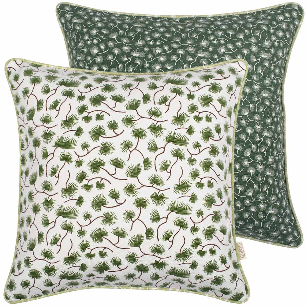 Inspired by Himalayan pinewoods, this cushion cover features a white Pine print on one side and forest green 'Mini Pine' print on the reverse.