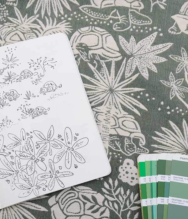 Seeing giant tortoises in Île aux Aigrettes Nature Reserve inspired our Tortoise cotton jacquard, a double sided fabric of animals and forest foliage, woven in a gorgeous earthy green.