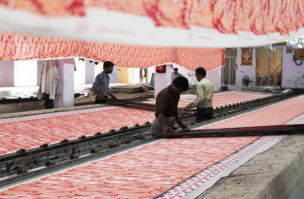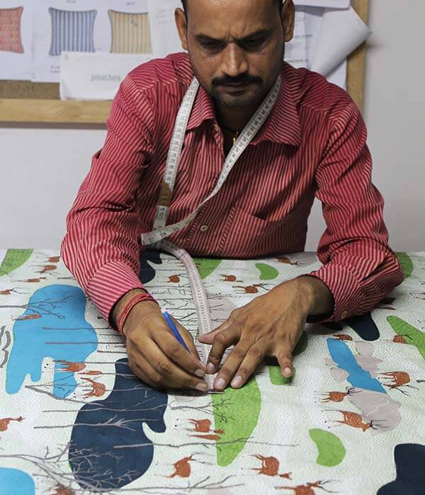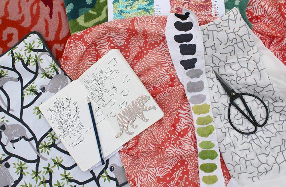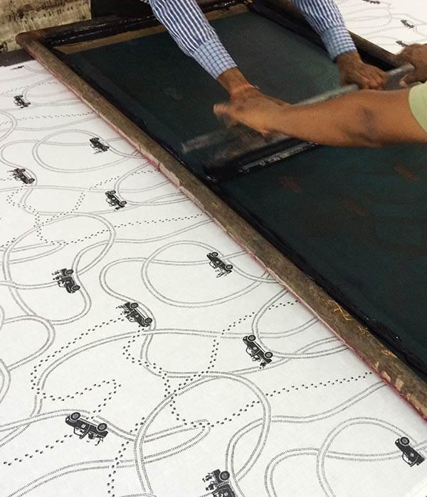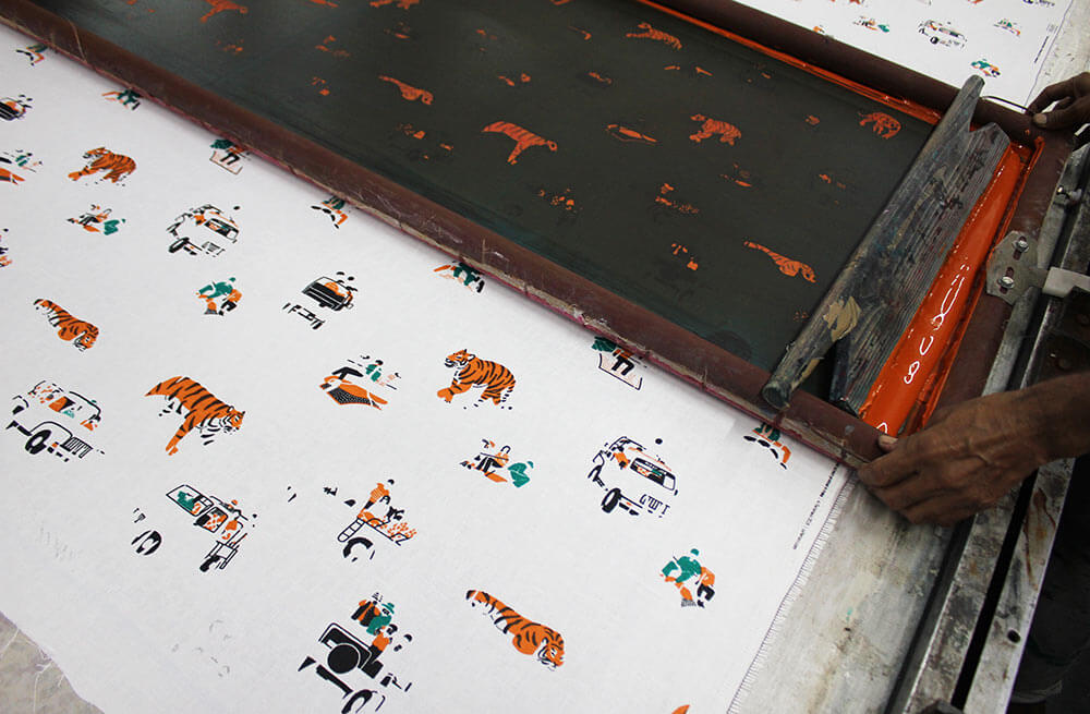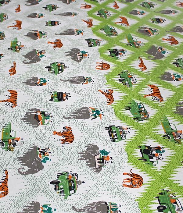 The Tiger Safari collection is inspired by adventures on Safari in the national parks of India. Our characterful hand screen printed fabrics tell the story of tourists in jeeps and on elephants circling tracks in the hope of spotting a tiger, whilst deer roam in the forest and monkeys chatter in the trees.