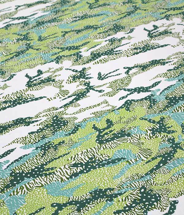 Inspired by hard to spot ‘Big Cats’ camouflaged in the jungle, our Big Cat Camo fabric is a wild mix of tiger stripes, leopard spots and camo print, hand screen printed in foliage green and fierce orange.