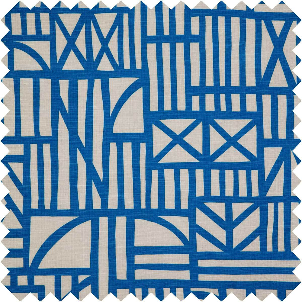 The graphic print on this fabric is inspired by the distinctive beams of timber framed Tudor buildings. Hand screen printed in a punchy cobalt blue, the large scale pattern brings a bold energy that is softened by a light ecru background.