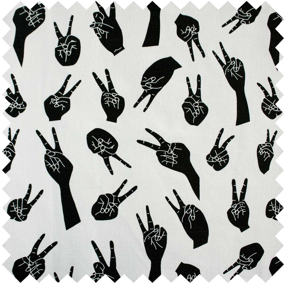Hand screen printed with all-over pattern of hands making the Peace Sign, the White Peace Hands fabric would make super cool curtains, blinds or upholstery. Screen printed by hand in black onto an off-white cotton linen base, it's a great choice for a fun, unique monochrome fabric.