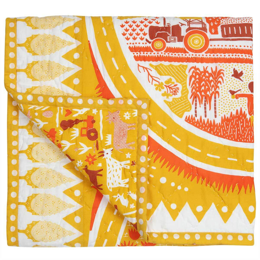 The limited edition Farm Life Baby Quilt is handmade in small batches by artisans in India. Hand screen printed onto cotton in vivid shades of mustard yellow, hot orange and rust brown, making it perfectly gender neutral. A lovely gift for a new baby, it can be used as a blanket, playmat or bedding. Packaged in a special cotton bag it makes a beautiful heirloom piece that will be treasured and passed on for many years.