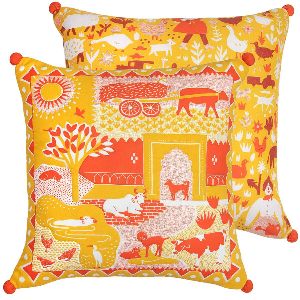 Hand screen printed in vibrant water based inks, Safomasi's India inspired farm animals print is one side, whilst Louise’s paper-cut pattern inspired by the farmsteads surrounding her home in Yorkshire is on the other.