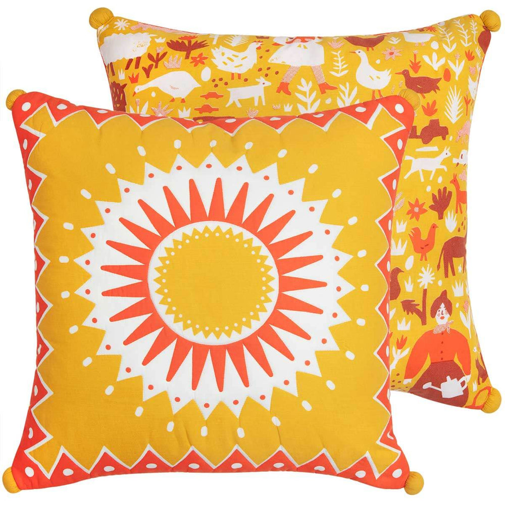 Designed to complement the Farm Life Baby Quilt, this cushion cover is reversible with one side featuring Safomasi's graphic yellow sun design (a motif seen in the baby quilt), and Louise's paper-cut pattern inspired by the farmsteads and small holdings found in the countryside near her Yorkshire home on the other.