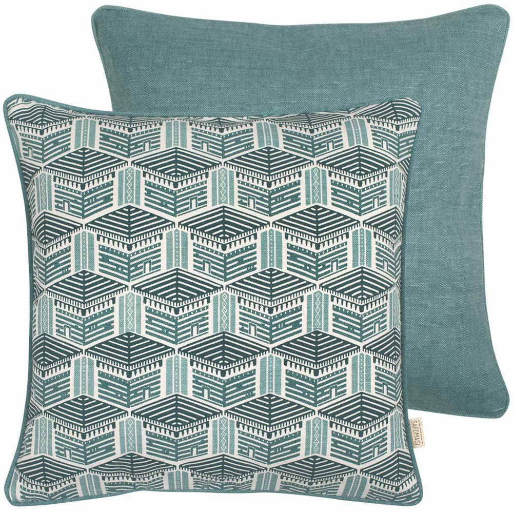 Illustrating traditional Kath Kuni homes commonly found in the Kullu district of Himachal Pradesh, the Blue Kullu House cushion cover features a solid blue printed back and piping.