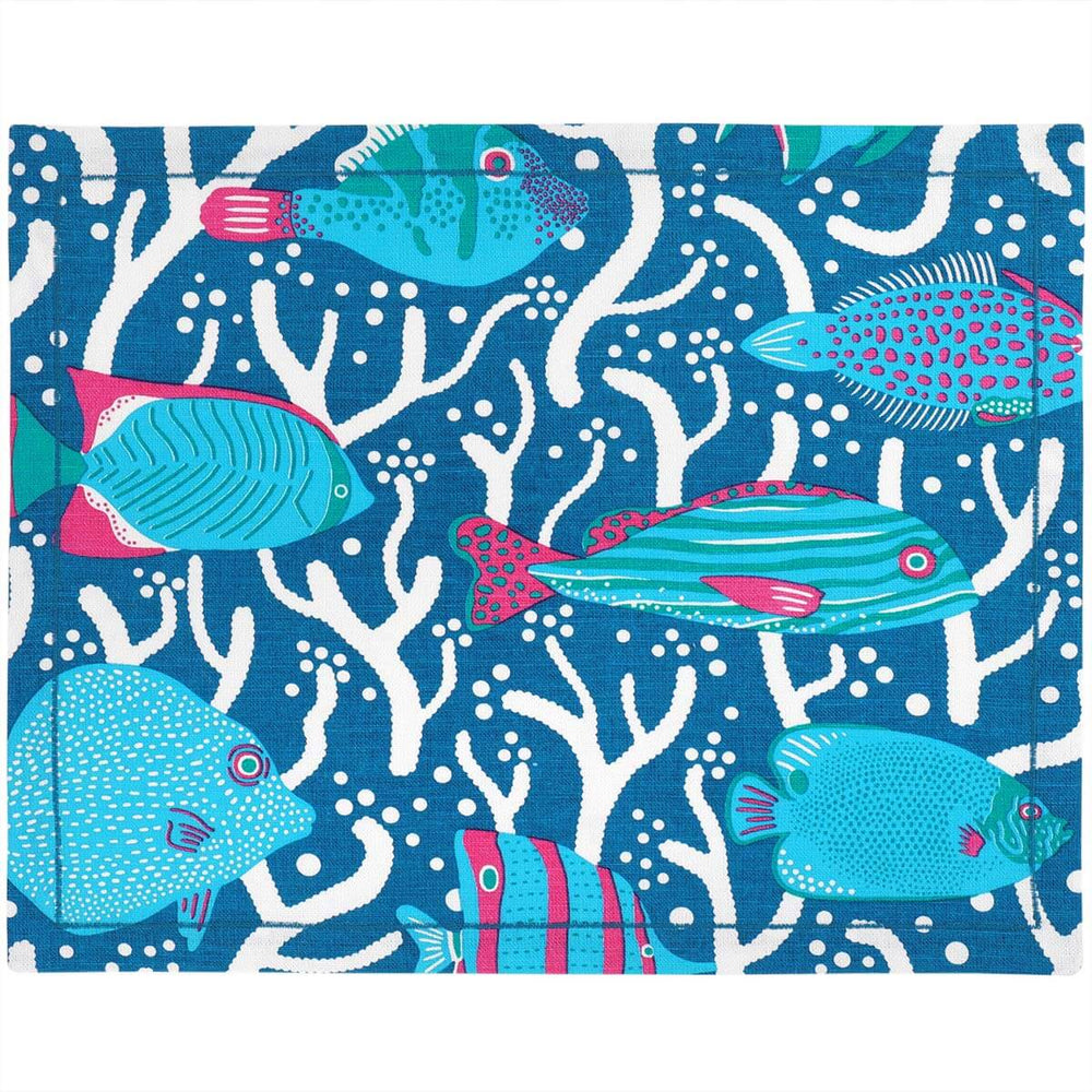 Set a stunning table with these placemats hand screen printed with a tropical fish pattern in deep shades of blue and teal.