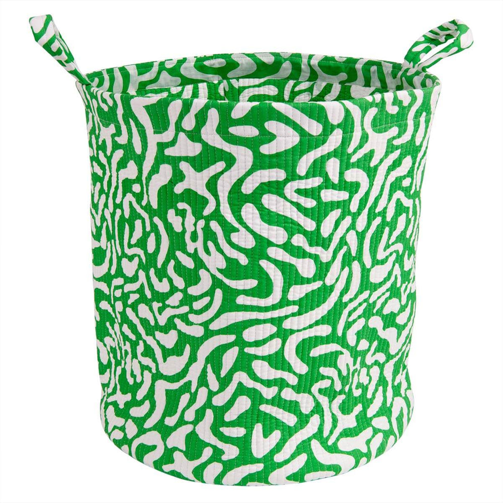 Add a pop of color and practicality to your home decor with this green quilted storage basket.