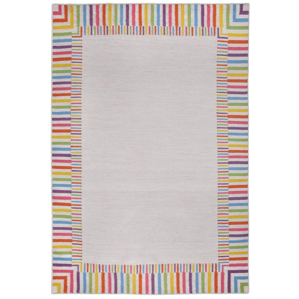 Made from NZ wool the multicoloured border on this flatweave rug brings just the right amount of colour to an otherwise neutral piece - perfects for kids rooms or for adding colour to a living room or dining room without it feeling overly playful.