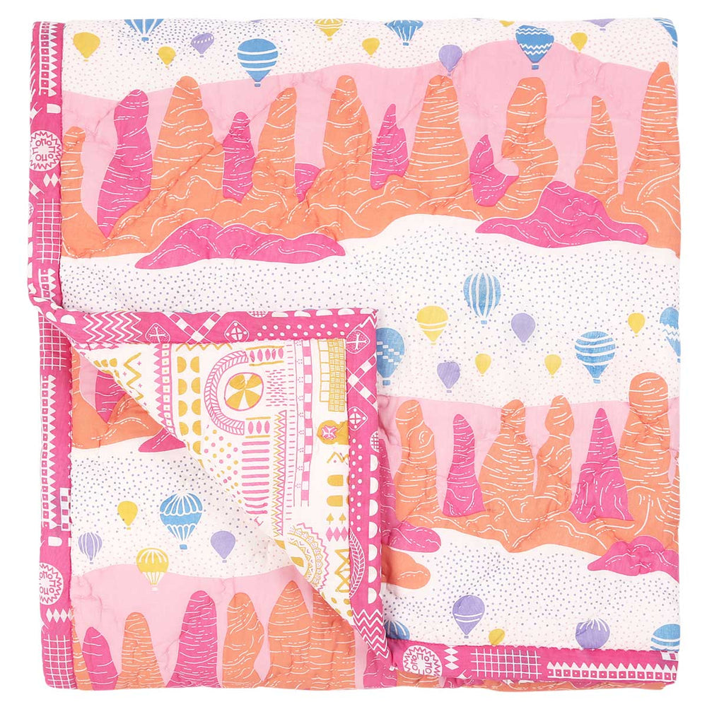 Pretty pink baby quilt handprinted with a dreamy landscape of hot air balloons floating over fairy chimney rock formations.