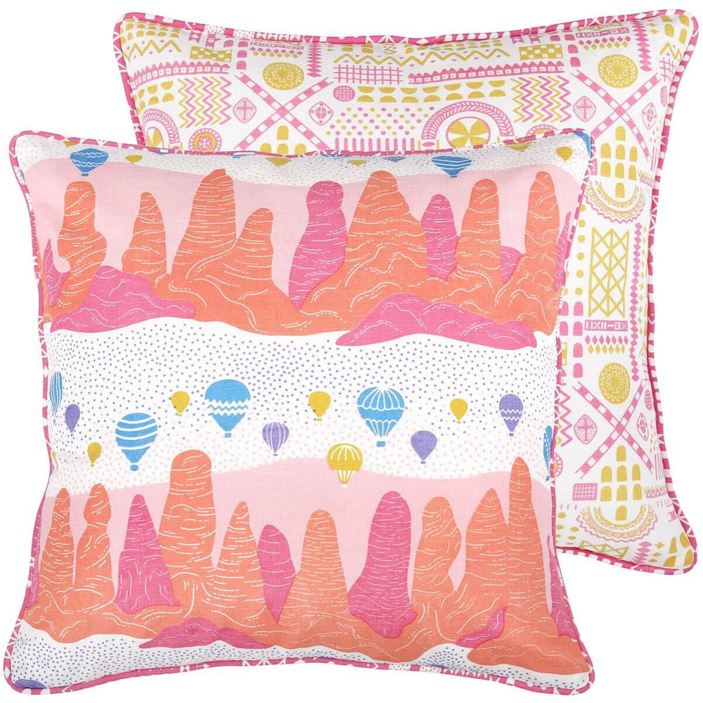 Hand screen printed in a joyful mix of pinks, orange, yellow and blue, this cushion will bring an element of the magical landscape of Cappadocia, Turkey into your living room. Reversible, the other side features an abstract print inspired by painted symbols and rock-cut windows and doors on cave houses and churches in the region.