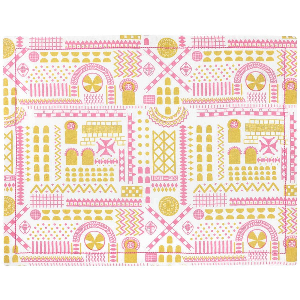 Easy to mix and match, this set of two placemats is handprinted in a pink and yellow geometric pattern inspired by painted frescoes and rock-cut windows and doors seen on our travels in Cappadocia, Turkey.