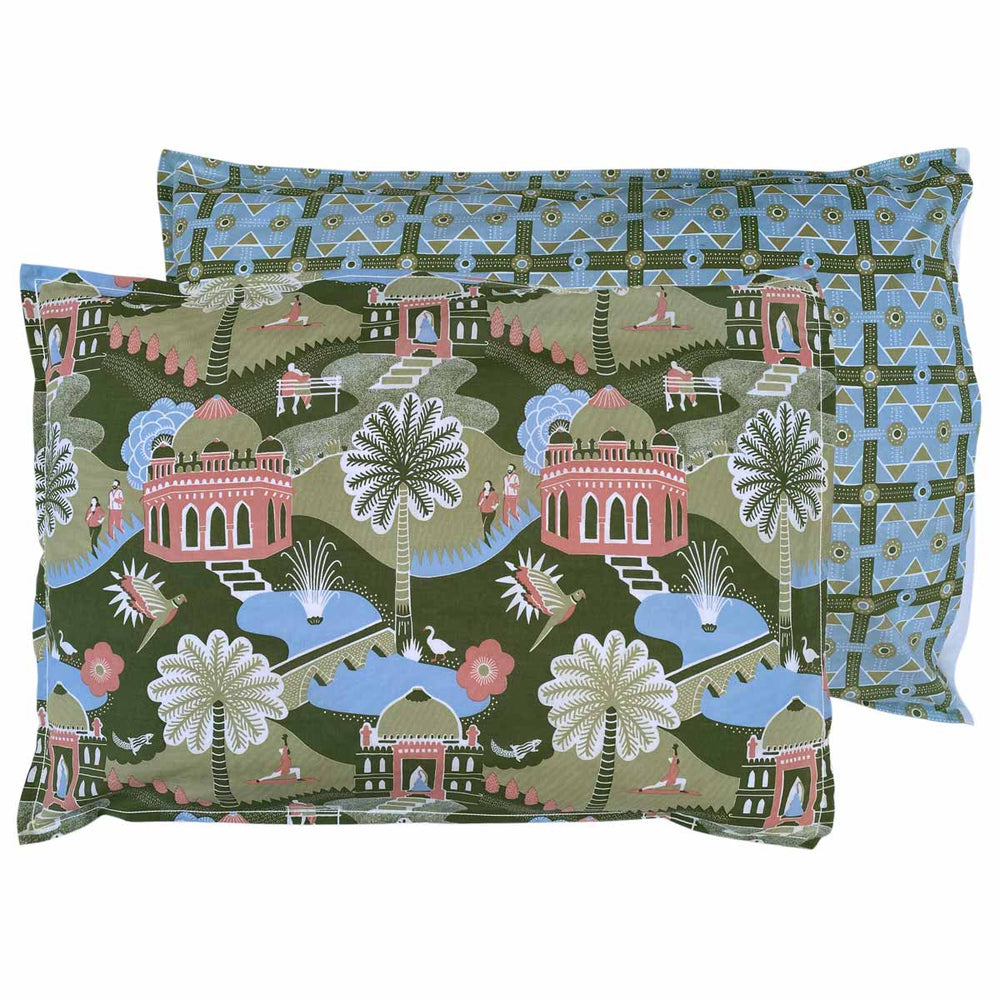 Hand screen printed with the Lodhi Garden print on one side and Blue Charbagh print on the other, this reversible pillowcase has an envelope closure and small flanged edge.