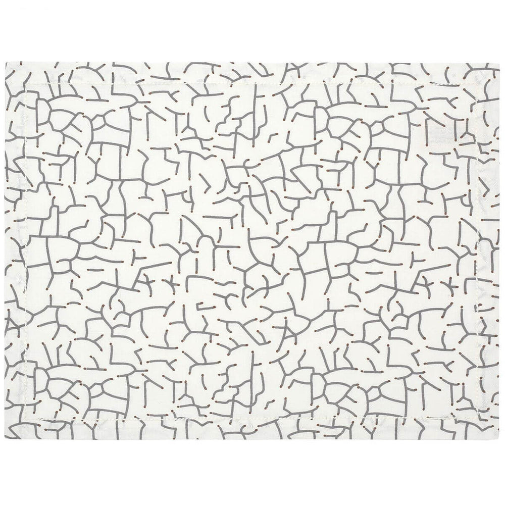 Set of two handprinted placemats featuring a crackle print inspired by arid earth. With copper accents and a white stitched border, they make for a chic table setting.