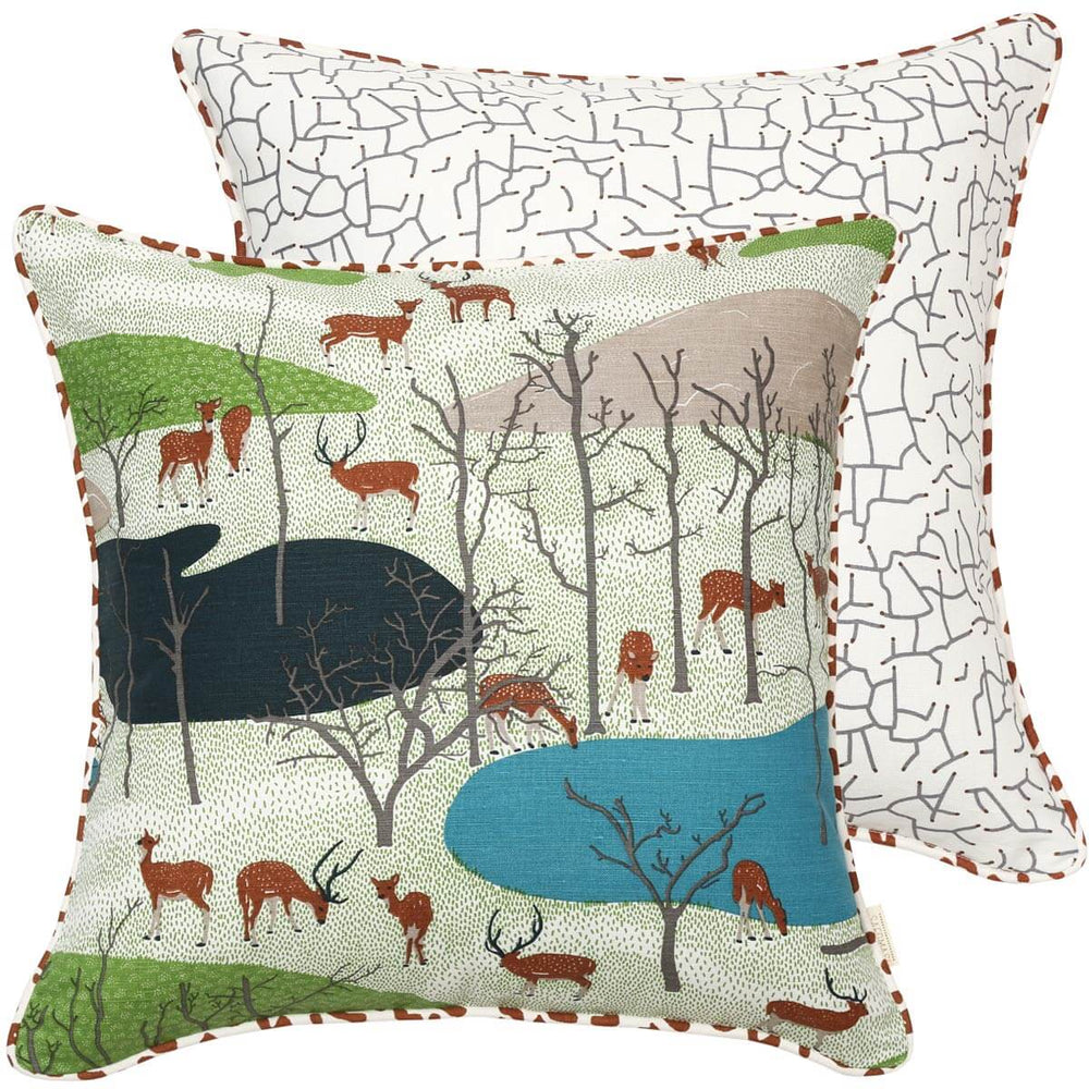 Meticulously printed by hand, the Spotted Deer cushion cover illustrates a dreamy scene of animals in the forests and meadows of central India. Paired with our grey and copper Arid Earth print on the reverse and brown leopard spot piping, it's a lovely way to add an element of nature to your decor.