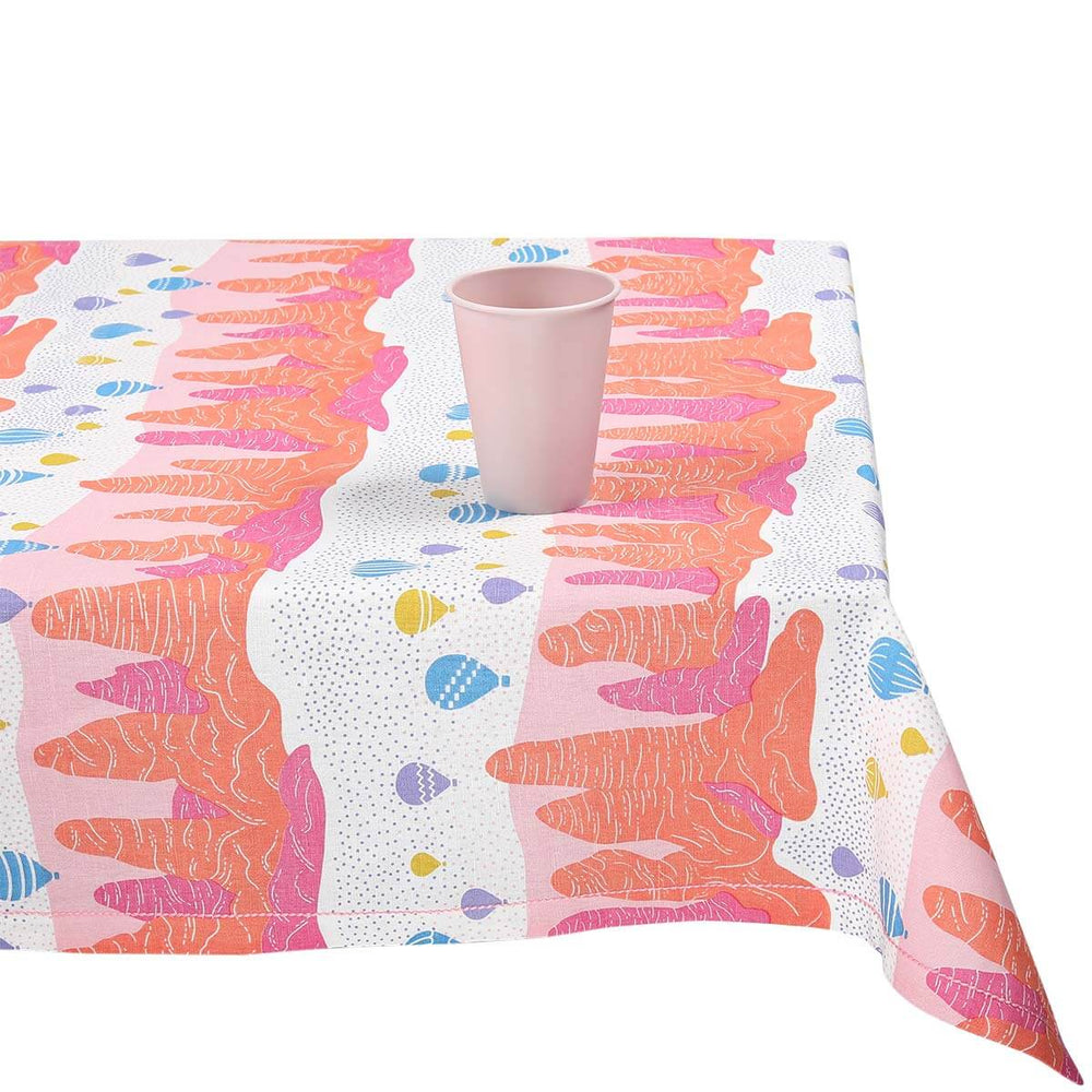 Handprinted with a whimsical scene of hot air balloons floating over fairy chimneys inspired by our travels in Turkey, this table cloth will bring a burst of colour and character to your table.