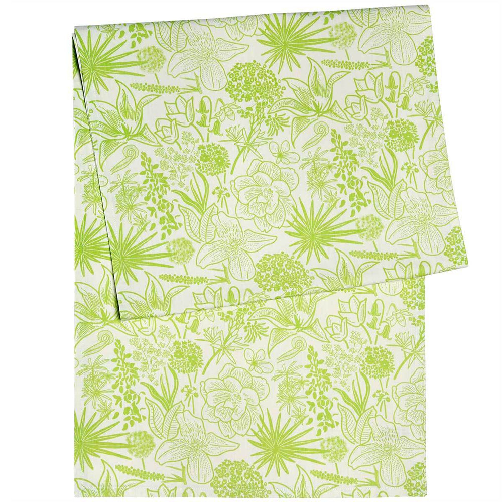 This cotton linen table runner, hand printed in a fresh light green with our Riviera print of English and Subtropical flora will make a pretty addition to your table. Complement with matching napkins and placemats (and fresh blooms!) for full on floral setting.
