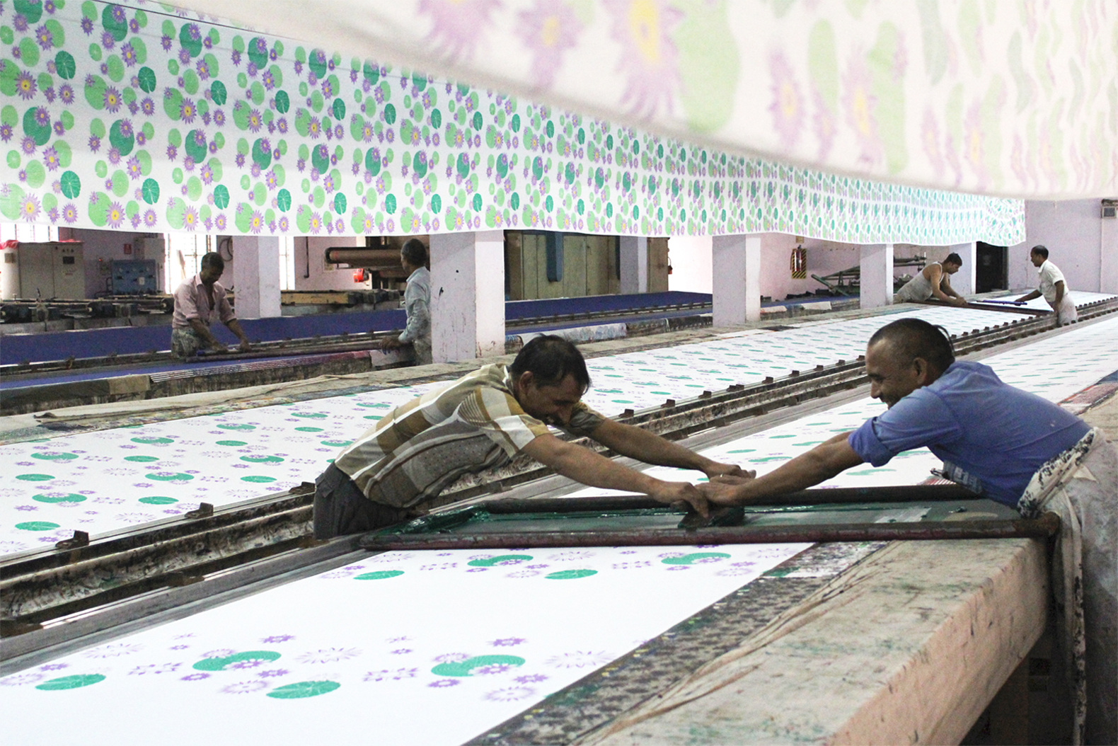 The majority of our fabrics are screen printed by hand, a process in which each colour in the design is printed separately through a mesh silk screen. This is a traditional print technique that requires skill and patience. We have a wonderful relationship with the family run screen printing workshop in Noida, near Delhi, who we have been working with for many years, and our favourite days are spent together sampling new designs.