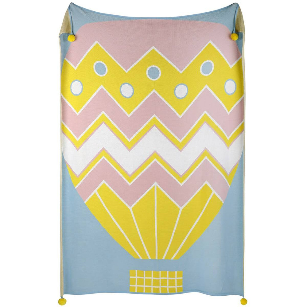 A cosy and uplifting blanket, knitted with a giant hot air balloon design.