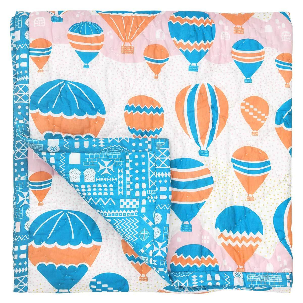Made from soft cotton and printed and quilted by hand, this charming baby quilt features a whimsical hot air balloon design inspired by travels in Cappadocia, Turkey, where hundreds of hot air balloons take to the sky at dawn and dusk.