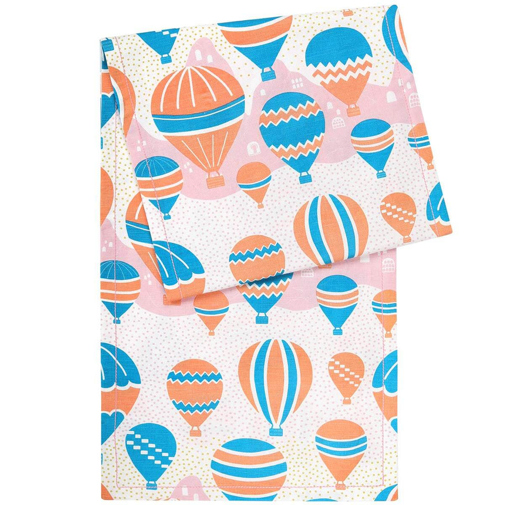 Handprinted in a colourful combination of blue, orange and pink this table runner is illustrated with a whimsical pattern of hot air balloons floating over the rocky Cappadocian landscape.