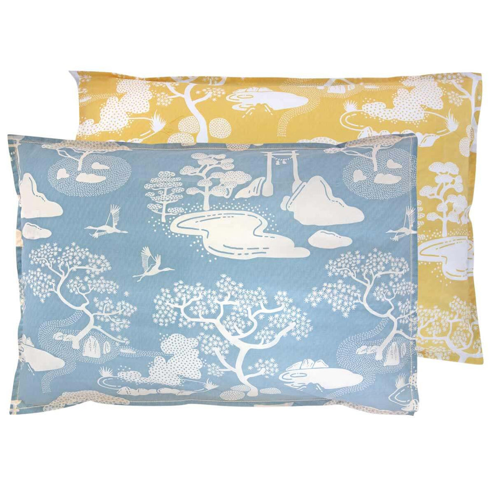 Hand screen printed in powder blue on one side and yellow on the other, this reversible cotton cambric pillowcase pairs with our Blue and Yellow Zen Onsen Garden Quilt to complete your bedroom look!