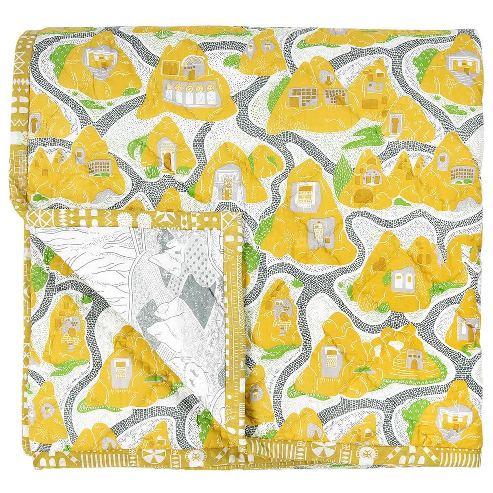 With a winding pattern of cave houses and rock formations on one side, and aerial valley view print on the other, this quilt tells the story of our travels in Cappadocia, Turkey. Hand screen printed in a winning combination of yellow and grey and quilted by hand, it’ll bring some sunshine into your bedroom.