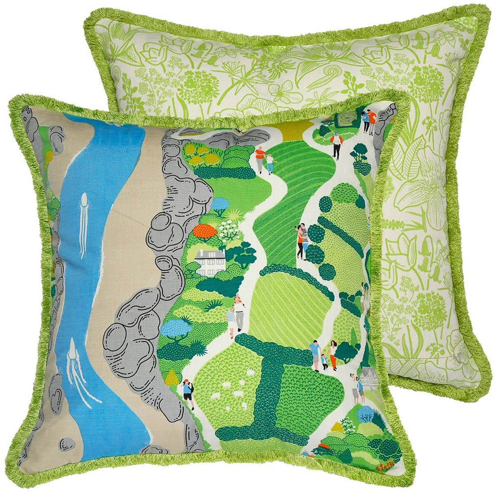 A vibrant statement piece, this linen blend cushion cover is hand printed with an illustrated scene of walks along the lush, hilly paths of the Salcombe estuary and out to sea. Reversible, the other side features a print of English and subtropical flora found in the region, set off by green fringe edging.