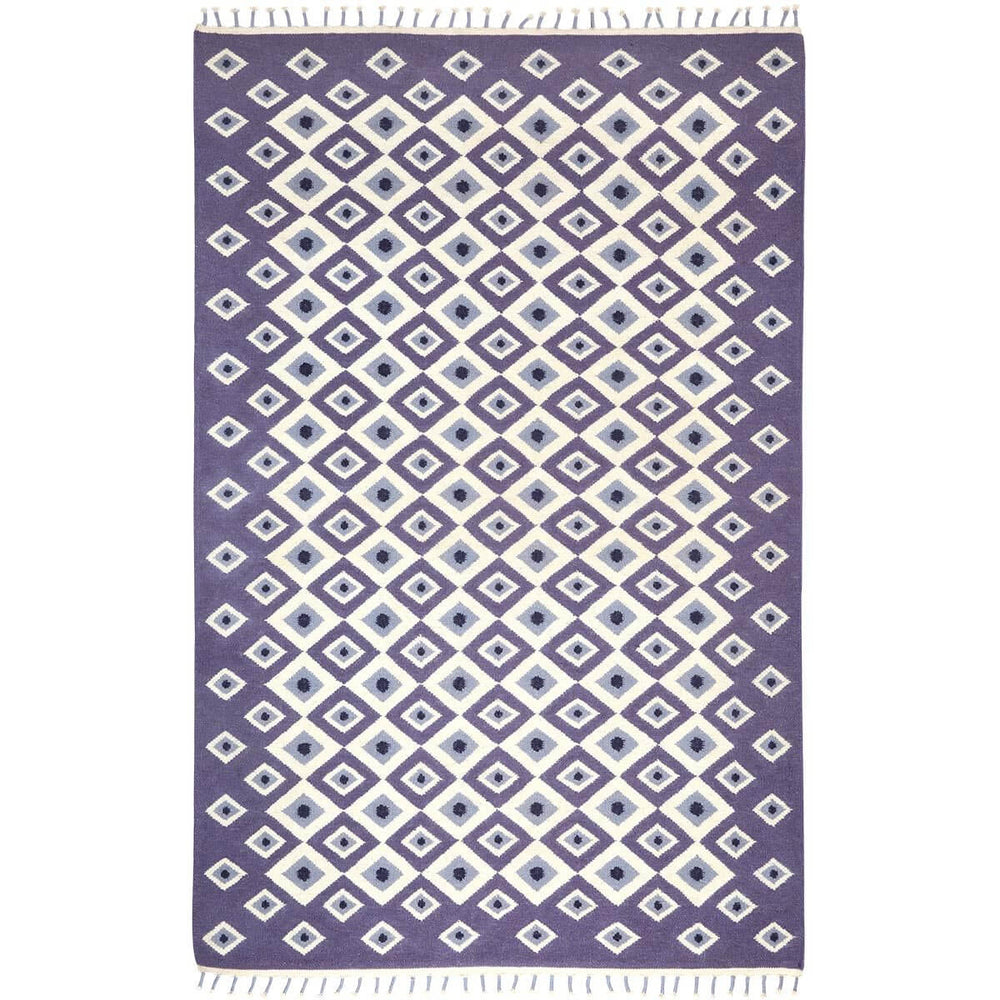 This lavender flatweave rug features soft blue-grey purple tones and Evil Eye motifs inspired by travels in Turkey.