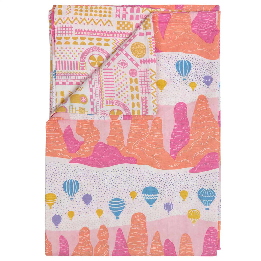 In pretty shades of pink, orange and yellow, the Fairy Chimney duvet cover set features a gorgeous landscape with hot air balloons floating in the sky on one side, and geometric 'Stone Symbol' print on the other. Hand screen printed onto breathable cotton linen, it gets softer with every wash.