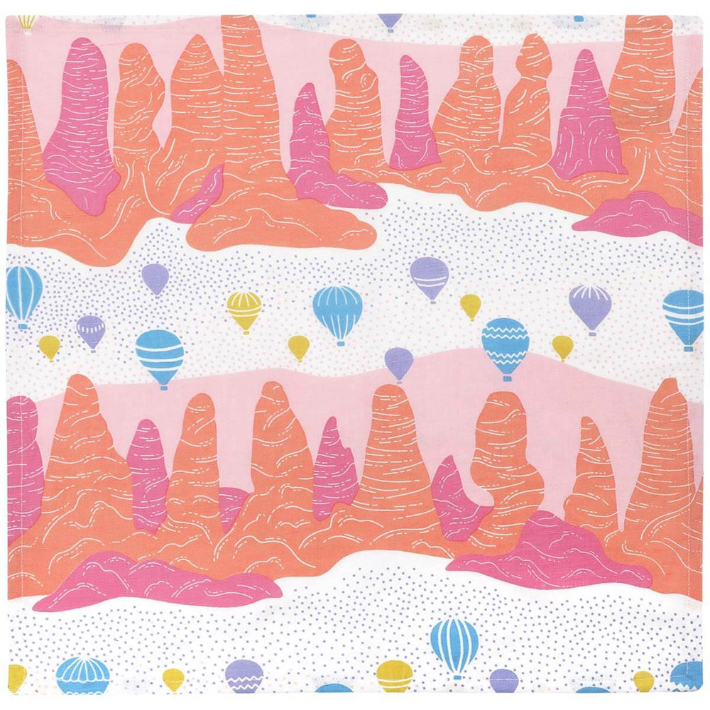 Illustrating the magical landscape of Cappadocia in Turkey where hot air balloons fly over fairy chimneys, this set of two napkins will add a whimsical, colourful touch to your table.