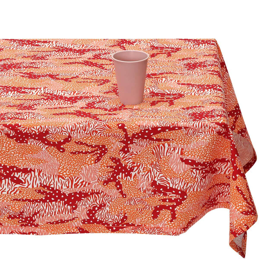 Transform your table with this striking orange table cloth. Handprinted on cotton linen in a vivid combination of tiger stripes, leopard spots and camouflage it's both fabulous and fierce!