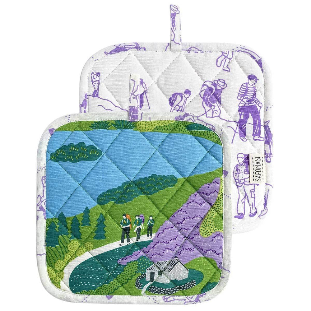 Fun printed pot holder with a colourful print of outdoor adventures inspired by the Lake District