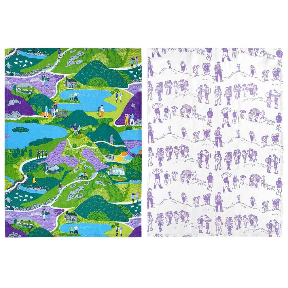 One tea towel illustrates the landscape of the Lake District with its colourful design of people enjoying their time in the fells, cumbrian cottages, a campsite, farms and more, whilst the other tea towel illustrates scenes of hill walkers, hand screen printed onto cotton linen with water based inks.